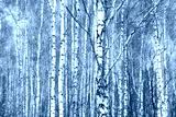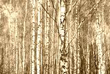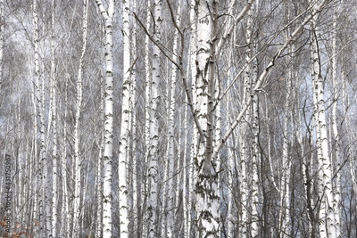 Young birch with black and white birch bark in spring in birch grove against background of other birches