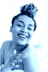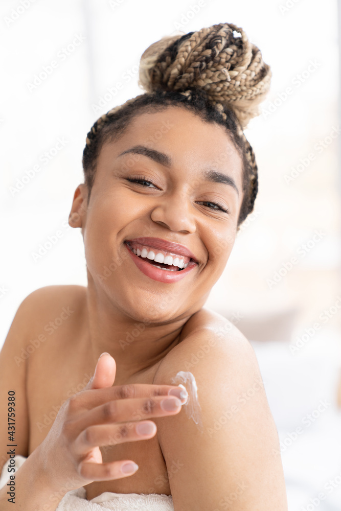 Pretty smiling young african-american woman in bath towel applying moisturizing cream on her body, taking care of her skin, body care, beautification concept, rejuvenation