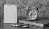 Workspace on a wooden table at home. Notepad for writing, diary, pen and alarm clock lie on the table.