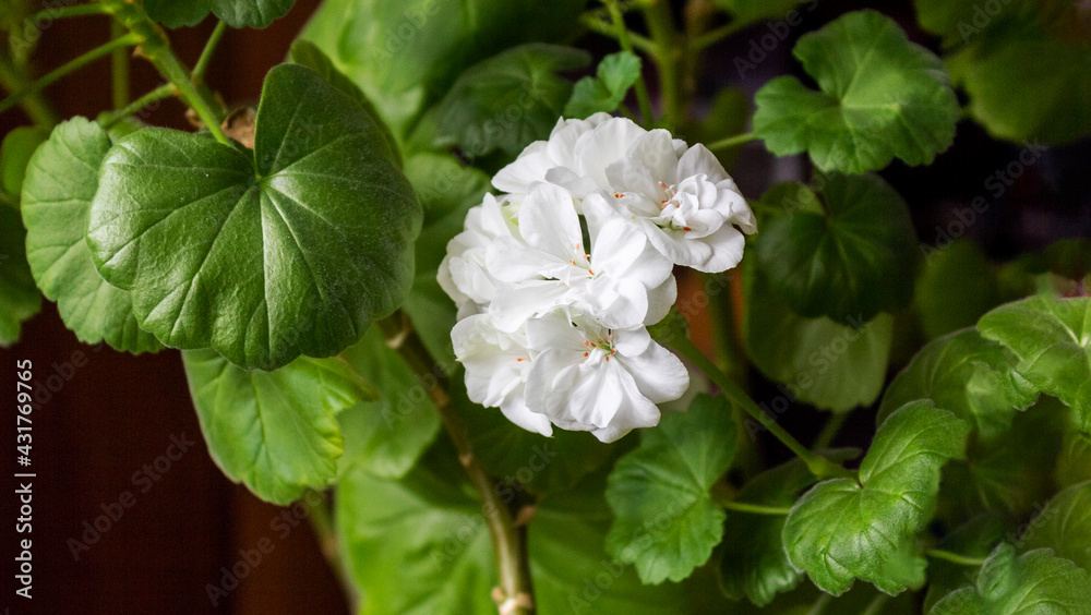 Geranium with white flowers, standing at home. Fragrant pelargonium.