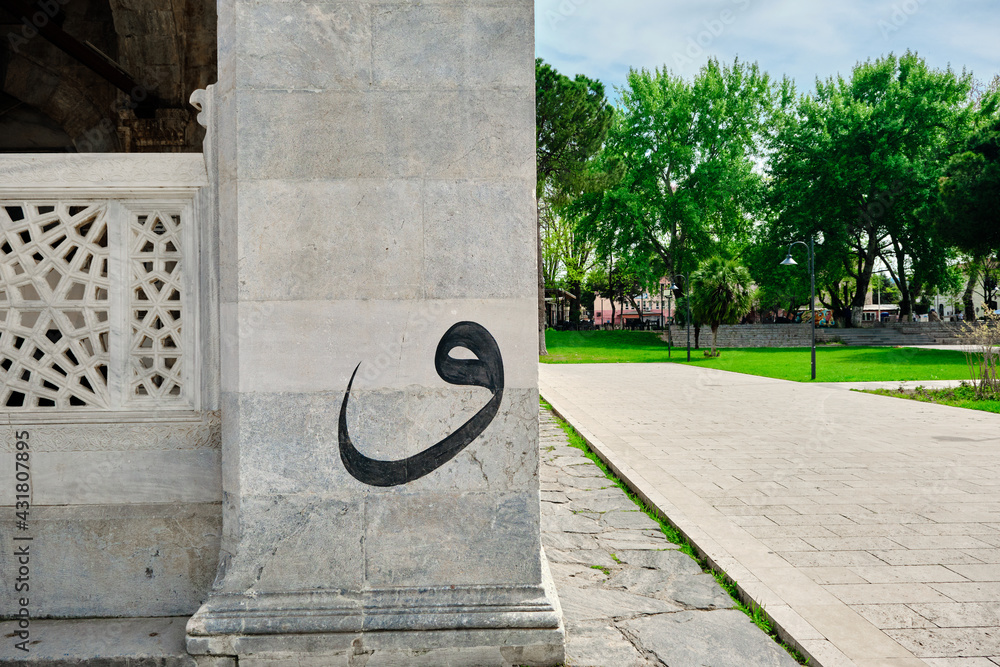 Bursa, Turkey. An arab letter of "vav" engraved on the wall of Green mosque (yesil camii) in Nicaea (iznik) and the wall made of marble stone with black color islamic letter and details.