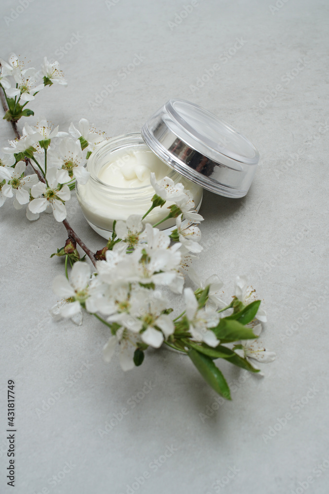 Beauty cream in a glass jar on a light gray background. Decorated with white spring flowers. Unbranded skincare product. Cosmetic cream. Close up, selective focus, high angle. .