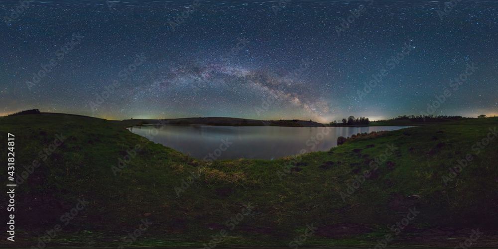 Spherical night panorama overlooking the lake under a bright starry sky. Beautiful arch of the Milky Way. 360 degree spherical panorama.