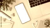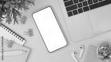 Female workspace with mobile phone, laptop, earphone, notebook and plant on pink pastel background.