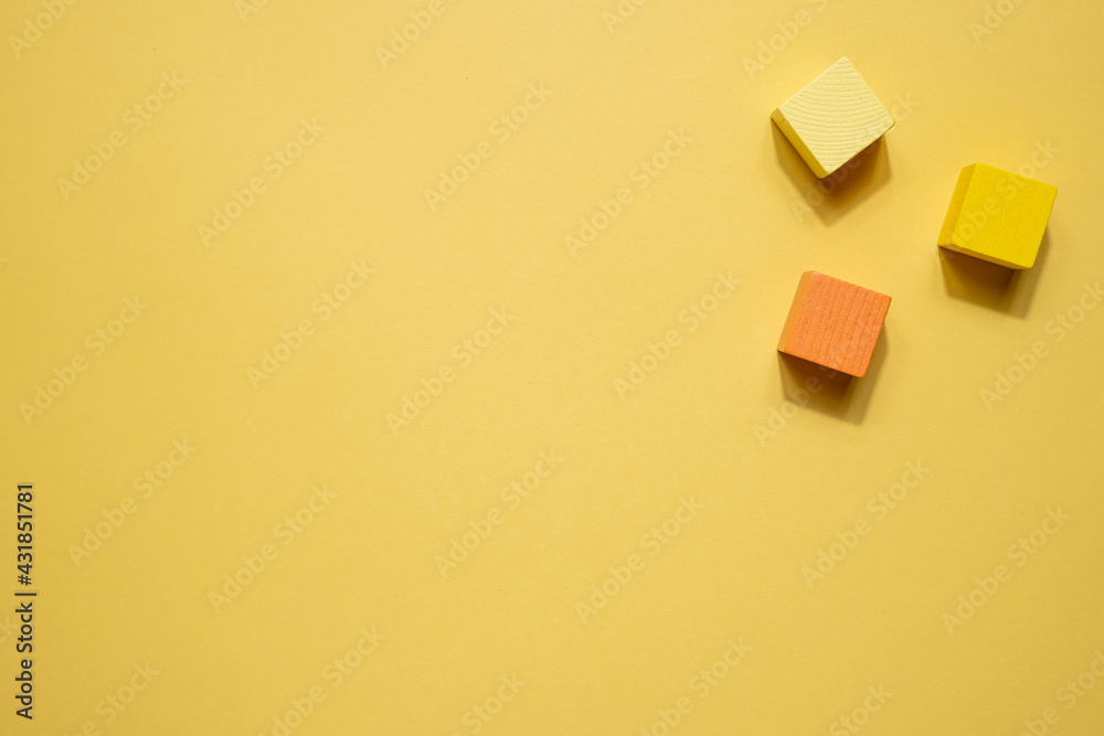 Yellow geometrical figures still life composition. Wooden game cube objects on yellow background. Platonic solids figures, simplicity concept