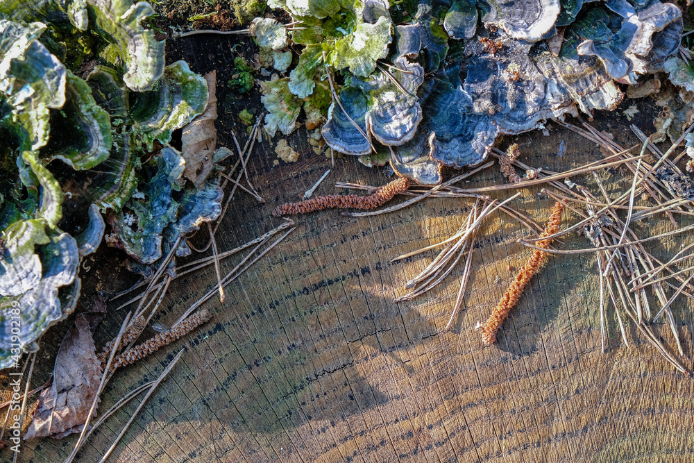 Trees background, dry needles, colored lichens. Wildlife texture. Inspiration board. Sunlight. Copy space.