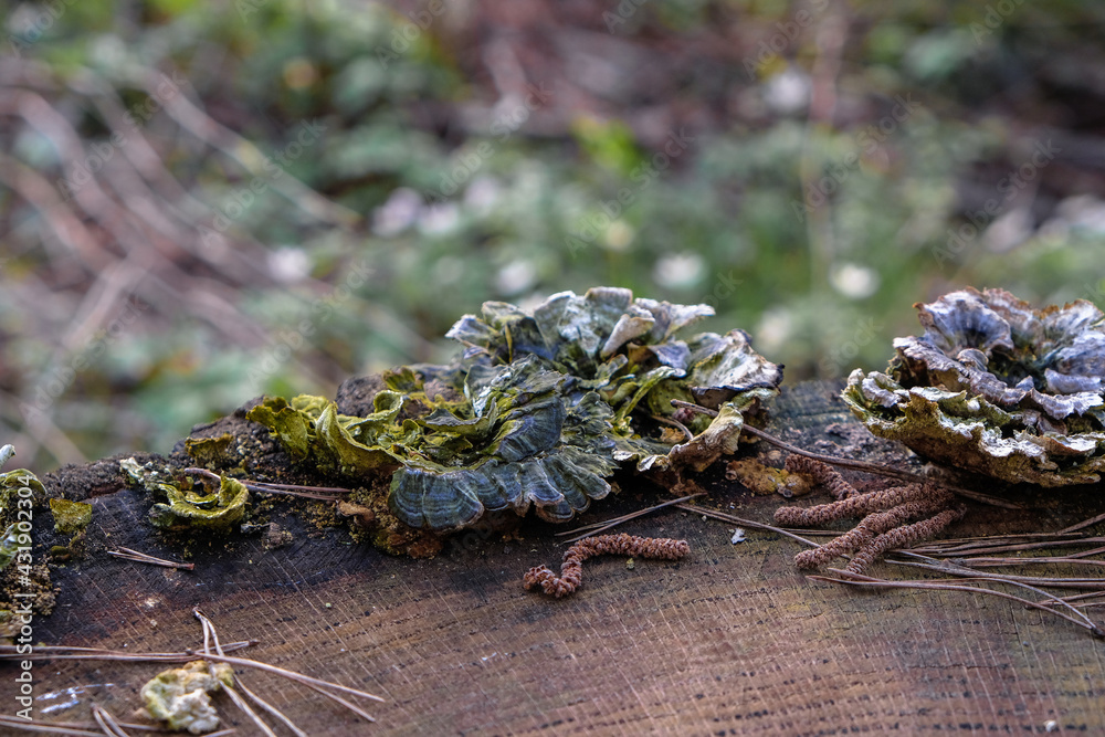 Colored lichens on the cut trunk. Wildlife texture.
