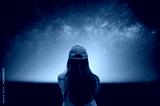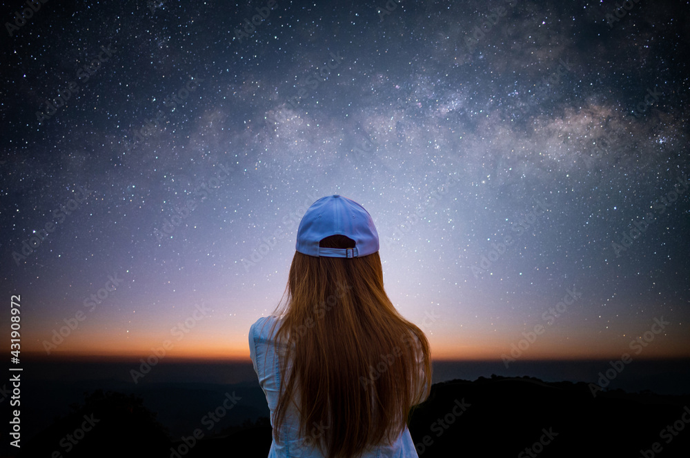 Silhouette of young woman looking beautiful view of night sky and star and milky way alone on top of the mountain. He enjoyed traveling and was successful when he reached the summit.