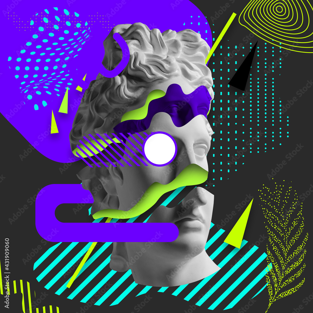 Contemporary art collage with antique statue head in a surreal style.