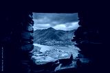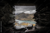 Beautiful view of mount Snowden landscape through window of abandoned miners bothie cottage in Dinorwic slate quarry North Wales. Derelict miners house with blue lake of water and dramatic sky clouds.