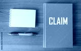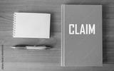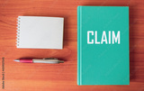 Claim, the word is written on a green notepad and a wooden table, next to a blank notepad for writing and a pen.