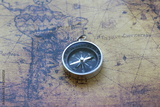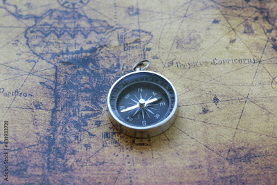Classic round compass on background of old vintage map of world as symbol of tourism with compass, travel with compass and outdoor activities with compass