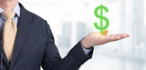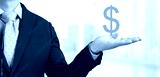 Businessman showing dollar sign. businessman is offering big green dollar symbol in his hand. Business and financial metaphor for investing, exchange, finance, success, banking, and sales.
