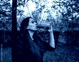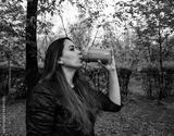 A young woman drinks a protein drink from a shaker on the street. A woman is holding a green shaker.