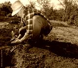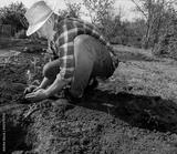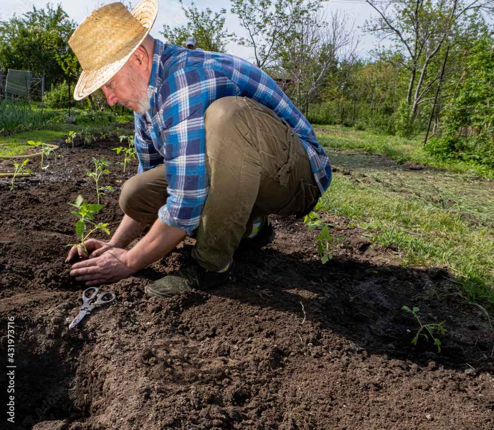 A middle-aged man with a beard and a hat planting a young tomato bush in the garden. A gardener who is going to plant a tomato. The man smiles.