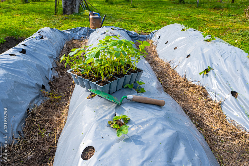 Tray with young plants of strawberry bushes in the garden. Strawberry seedlings ready for planting in the garden.