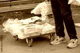 Newspapers on a wheelbarrow and the legs of a newspaper peddler