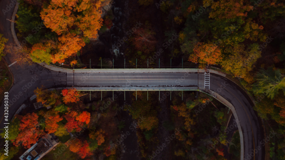 Aerial of Stewart Avenue Deck Truss Bridge over Canyon & Waterfall - Peak Autumn Colors - Ithaca, New York