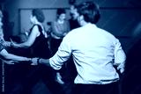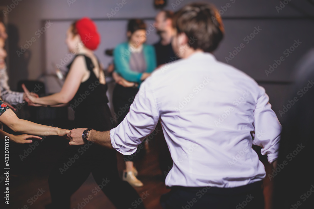 Young couple dance retro jazz swing dances on a ballroom club wooden floor in retro vintage clothes dress, female and male, rock dance lessons, process of dancing