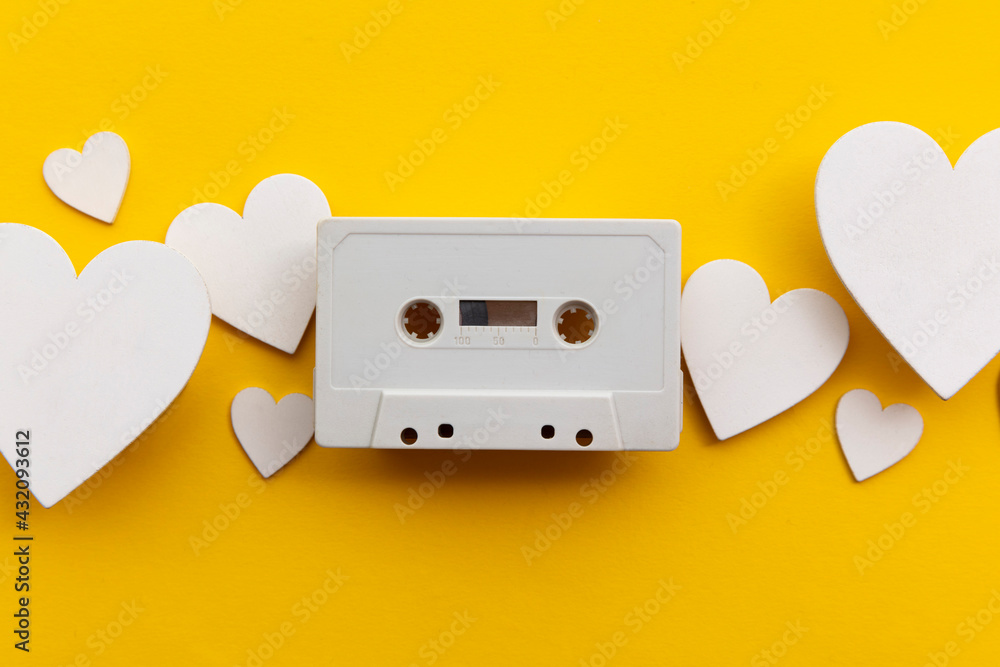retro audio cassette tape surrounded by white love hearts