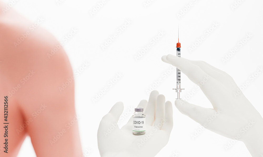 Medical worker in white rubber gloves holds Syringe and Vaccine against Covid-19. Immunity from the global coronavirus With vaccination. Prepare to inject into the shoulder or upper arm. 3D Rendering
