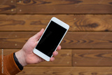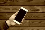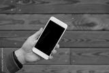 Man holds a Mockup of a smartphone with a black display close-up on a wooden background.