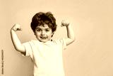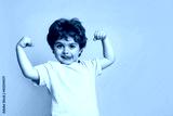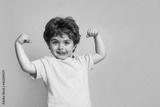Portrait of little kid boy isolated over pink background showing tongue. Funny little power super hero kid showing muscles. Strength, confidence or defense from bullying. Kindergarten or school kid.