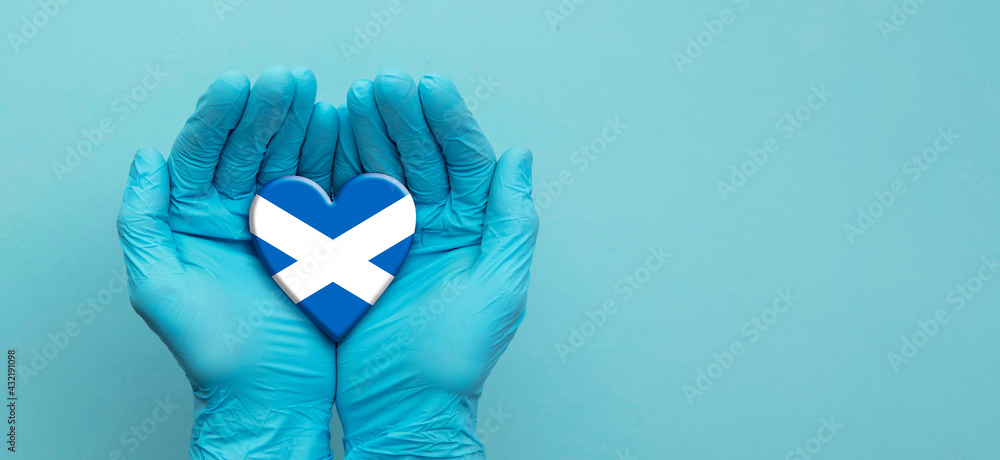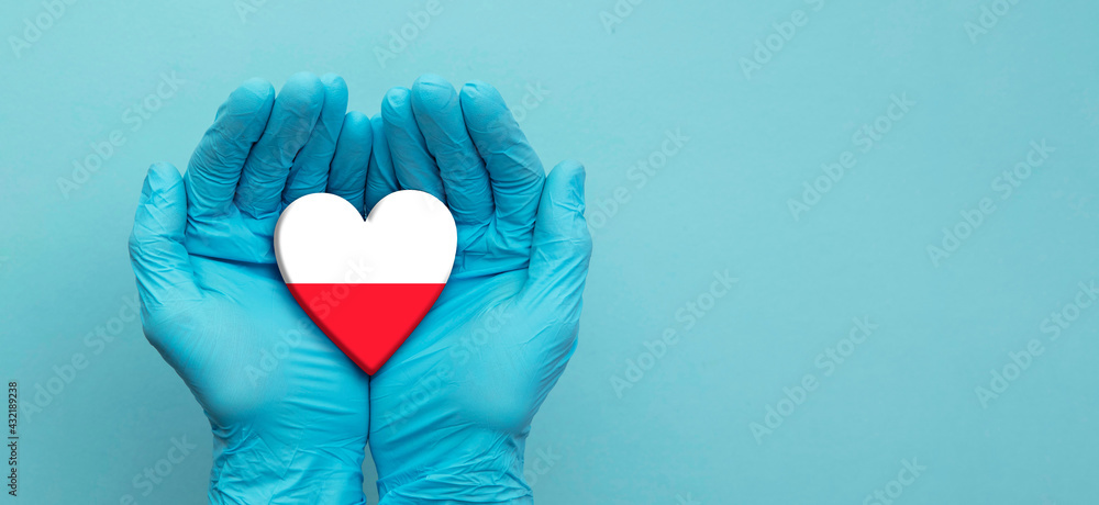 Doctors hands wearing surgical gloves holding Poland flag heart