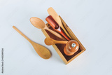 Set of wood foodware in box on background.