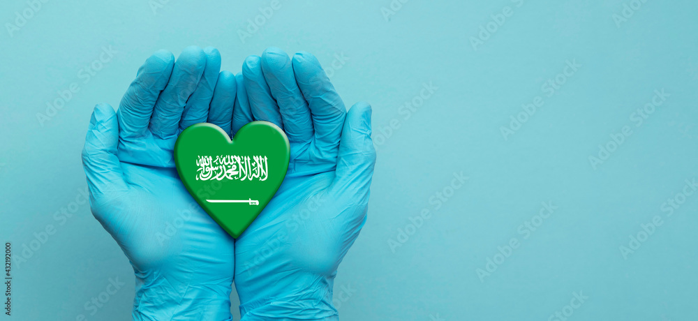 Doctors hands wearing surgical gloves holding Saudi Arabia flag heart
