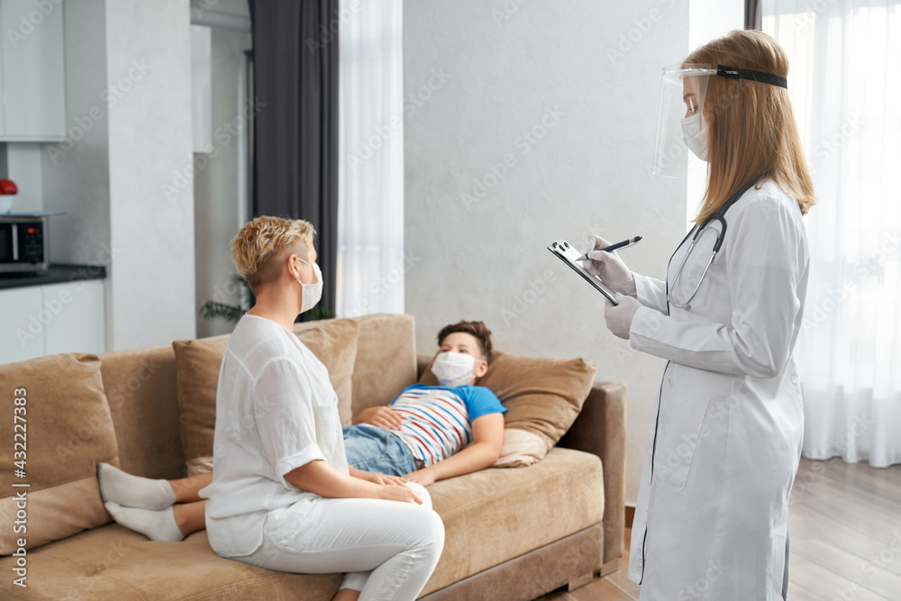Caring mother sitting on couch near her sick son while competent doctor in medical uniform standing near and writing on clipboard. Pediatrician visiting patient at home.