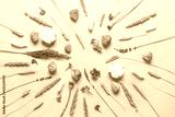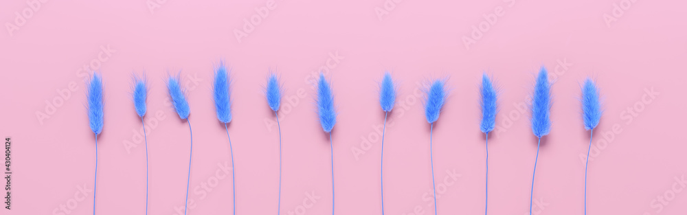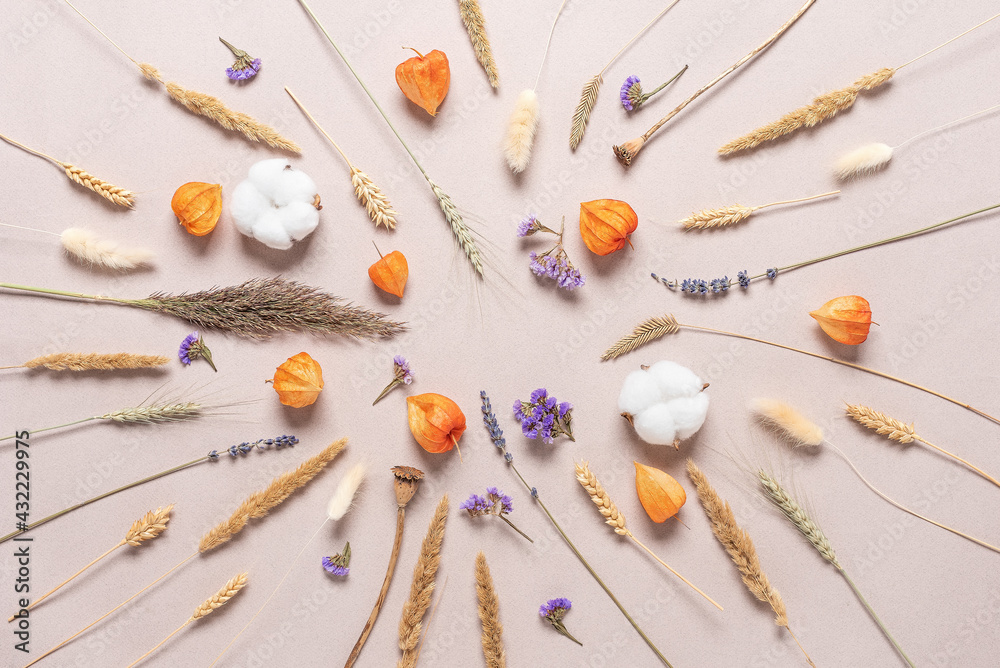 Flower composition. Dry flowers, grass and ears on beige craft paper. Beautiful floral art background. Top view, flat lay.