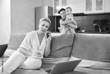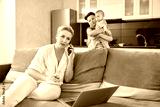 Busy mother talking on mobile and working on modern laptop while her children playing together. Woman doing remote work at home during maternity leave.