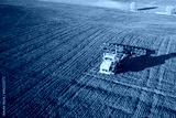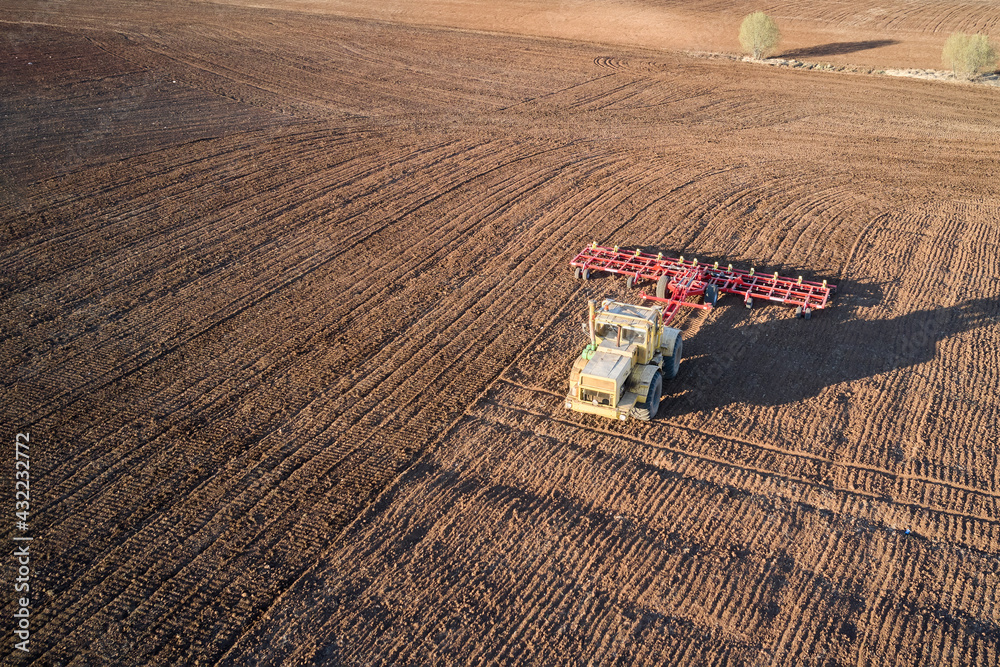 A heavy tractor plows the field. Shooting from a drone. Copy space.