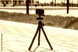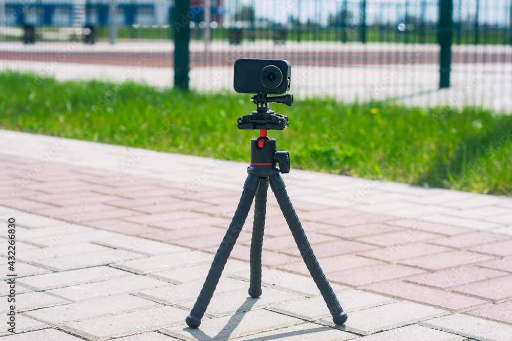 Compact action camera on a flexible tripod. Outdoor travel equipment.