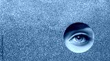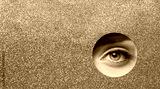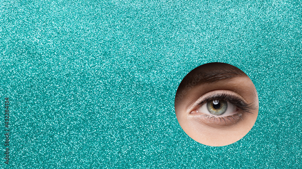 Eye Close up. Beauty Woman Eye Macro Make up. Green Pupil Eye Makeup Closeup looking out Hole Glitter Blue Paper. Eyelashes Extensions, Eyeliner, Eye Correction