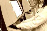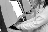 Confirm flight details. Close-up female hands is using self-service check-in kiosk while standing at international airport building. She is registering on airplane