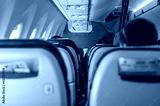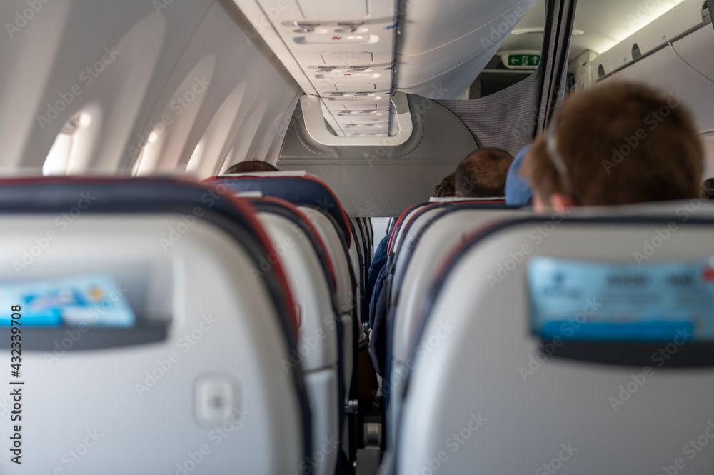 Passenger in a airplane cabin during a flight viewed from the rear. Interior of commercial airplane with unrecognizable passengers on their seats during flight shot from the rear of airplane.