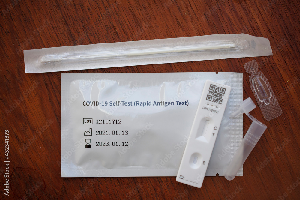 Close up of a coronavirus covid-19 rapid antigen home testing kit