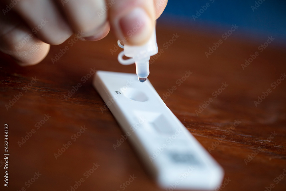 Close up of a person using coronavirus covid-19 rapid antigen home testing kit
