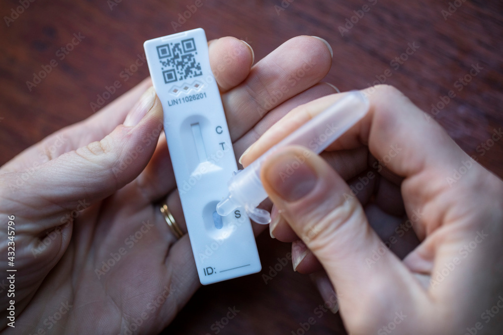 Close up of a person using coronavirus covid-19 rapid antigen home testing kit