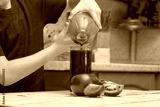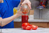 Pour fresh tomato juice from red tomatoes into a glass in the kitchen