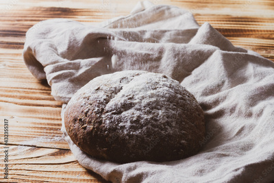Dark rye grain bread with round shape on beige napkin and wooden natural background