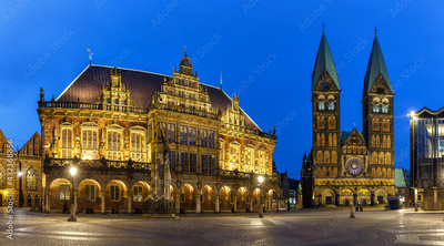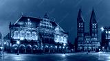 Bremen market square town hall Dom church Roland panoramic view in Germany at night blue hour