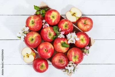 Apples fruits red apple fruit box on wooden board with leaves and blossoms