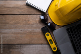 engineer or architect desk background, helmet, computer or laptop on the table in the office, project ideas concept