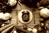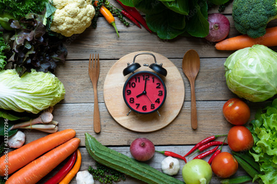 Food clock spoon and fork with vetgetable, Healthy food breakfast concept on wooden table background