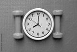Time for exercising clock and dumbbell with blue yoga mat background, sport and healthy concept