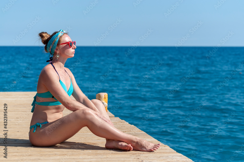 Woman tourist illetas Formentera saying boat goodbye gesture turquoirse sea