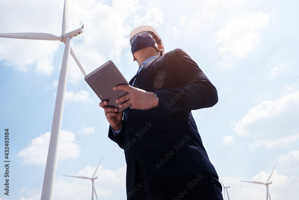 Successful engineer windmills manager wearing face mask and using tablet with wind turbine in background